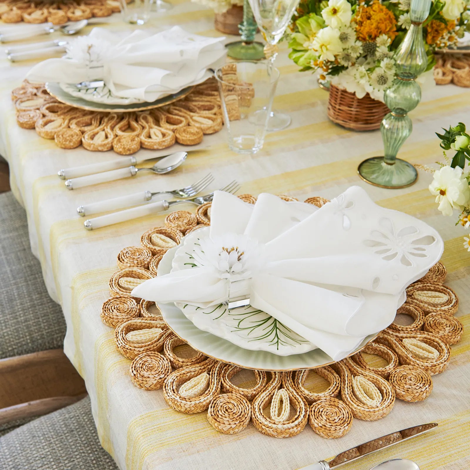 “Kim Seybert’s beautifully elaborate Dahlia Table Runner is the ultimate way to ring in springtime and complete your Easter tablescape.”