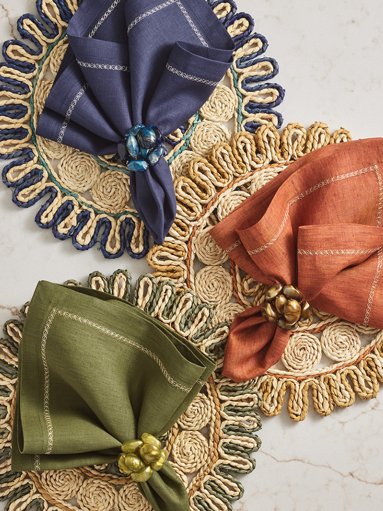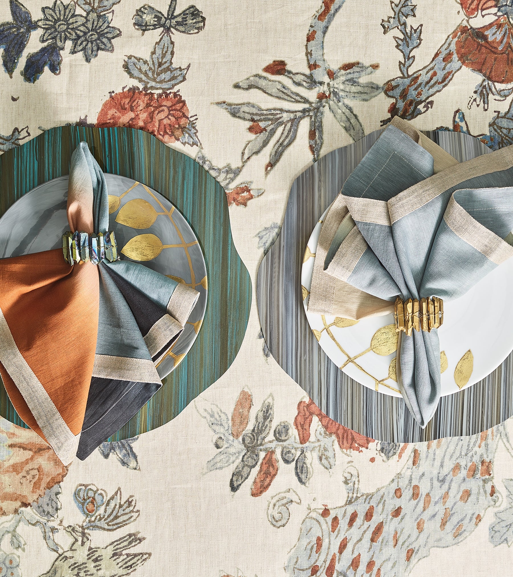 "A brand known for elevating tabletops with its often lavish materials for placemats, napkins, and napkin rings.”