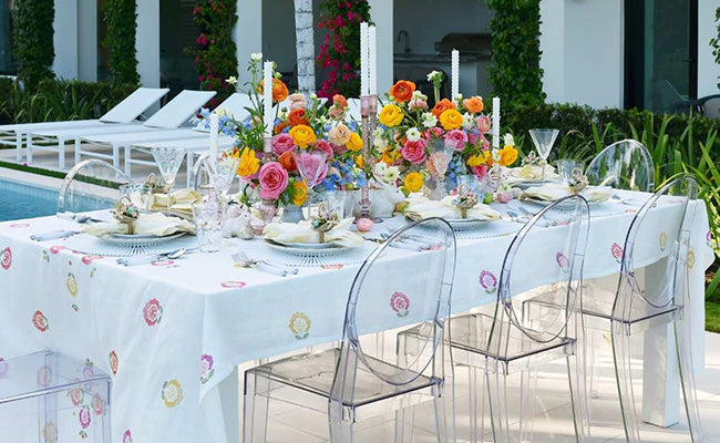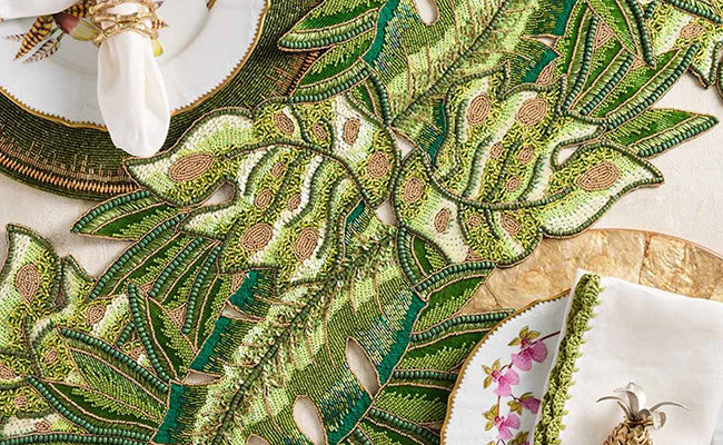 Summer calls for bright and vibrant colors that capture the season’s energy and warmth. Opt for shades like turquoise, coral, and sunny yellow. These colors not only invigorate the table setting but also reflect the lively and playful nature of summer. Consider using bold, tropical-themed table runners or incorporating bright, citrus-inspired accents. Pair these vibrant hues with lightweight, breathable materials like linen to maintain a cool and casual feel for your summer gatherings. Our Belize Runner epitomizes summertime. Inspired by the beauty of Central American jungles, its design features a gorgeous and vibrant floral pattern, making it perfect for showcasing in your summer home or aboard a yacht.