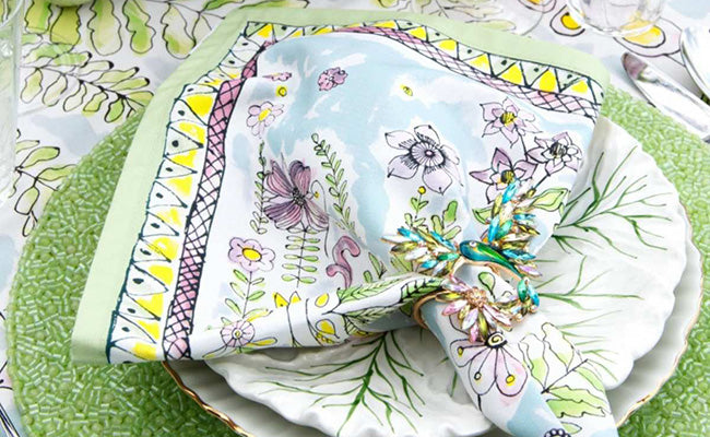 Blush Pink and Champagne: Ideal for weddings or romantic dinners, blush pink combined with champagne creates a soft, feminine look. The delicate pink tones are enhanced by the warm, metallic champagne, adding a touch of glamour. Our Dahlia Runner is a gorgeous pink floral runner perfect for any wedding occasion. Simply pair it with a metallic napkin and the Flutter Napkin Ring in Champagne & Gold.
