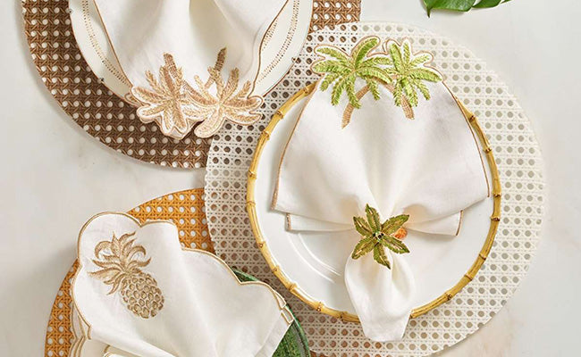 Emerald Green and White: This combination exudes freshness and elegance. Emerald green brings a rich, vibrant color, while white adds a crisp, clean contrast, making it suitable for holiday parties and upscale events. The Paradiso Runner features a stunning blend of green and gold interlocking vines and beaded hummingbirds. For a more sophisticated look, pair it with the Jardin Napkin and the matching Hummingbird Napkin Ring.