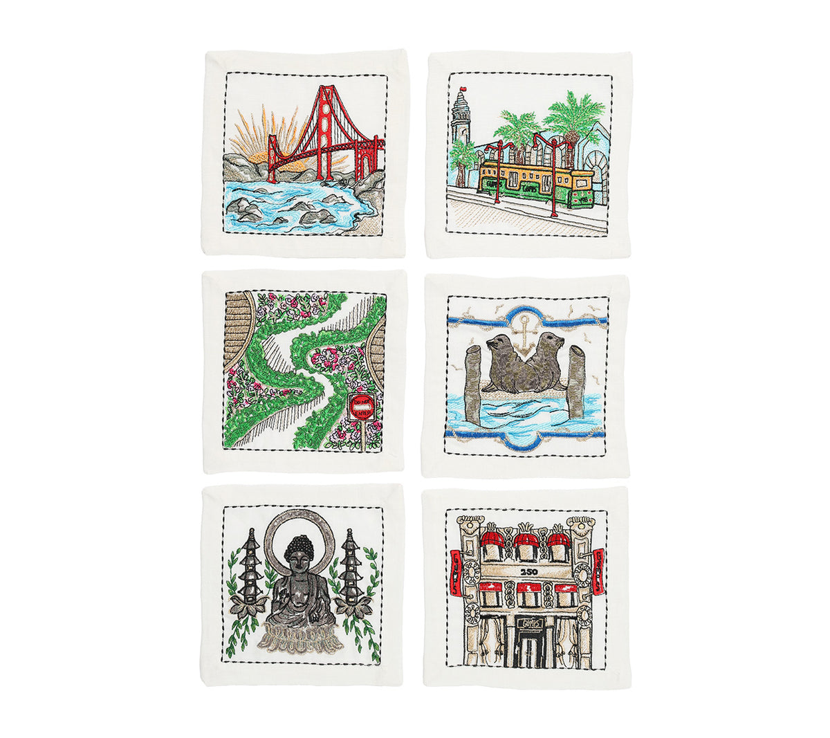 An exclusive cocktail napkin creation featuring the San Francisco landmarks for Gump's iconic department store.