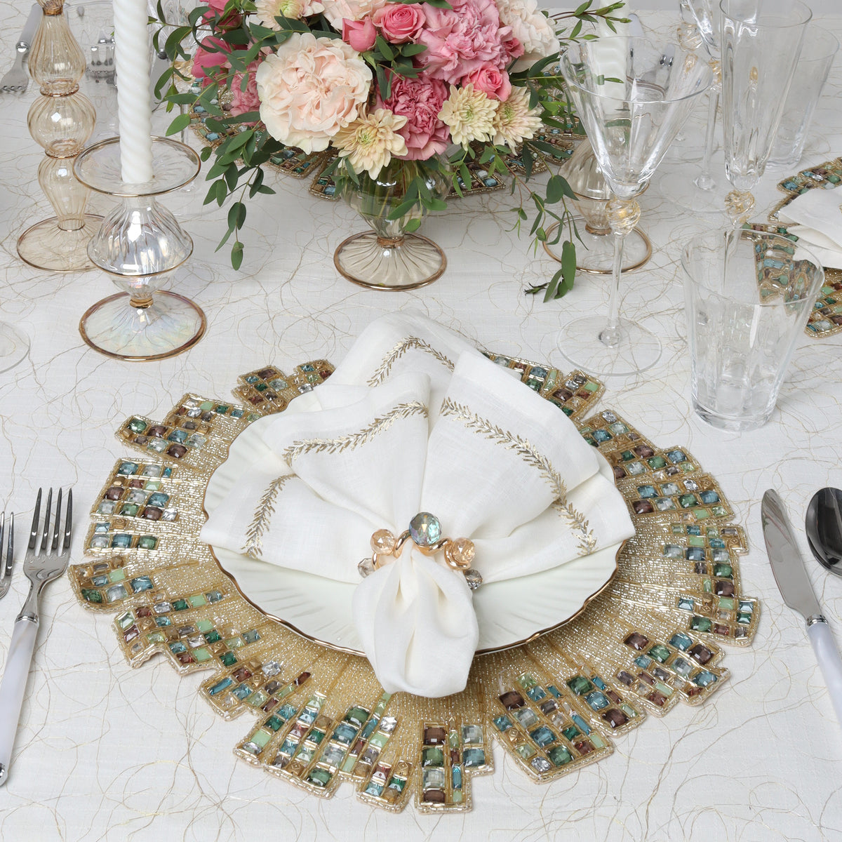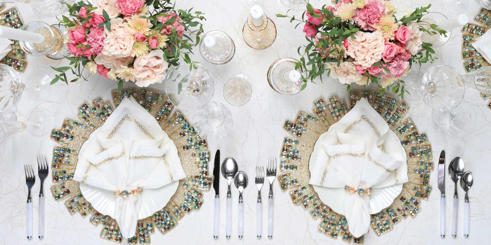 Make us the go-to for all the dining decor a bride will need for her wedding reception tables, bridal shower, or rehearsal dinner. Find luxurious beaded placemats, gold chargers, napkin rings, linen napkins, table runners, and glassware sure to fit any bride's style, from modern to traditional.