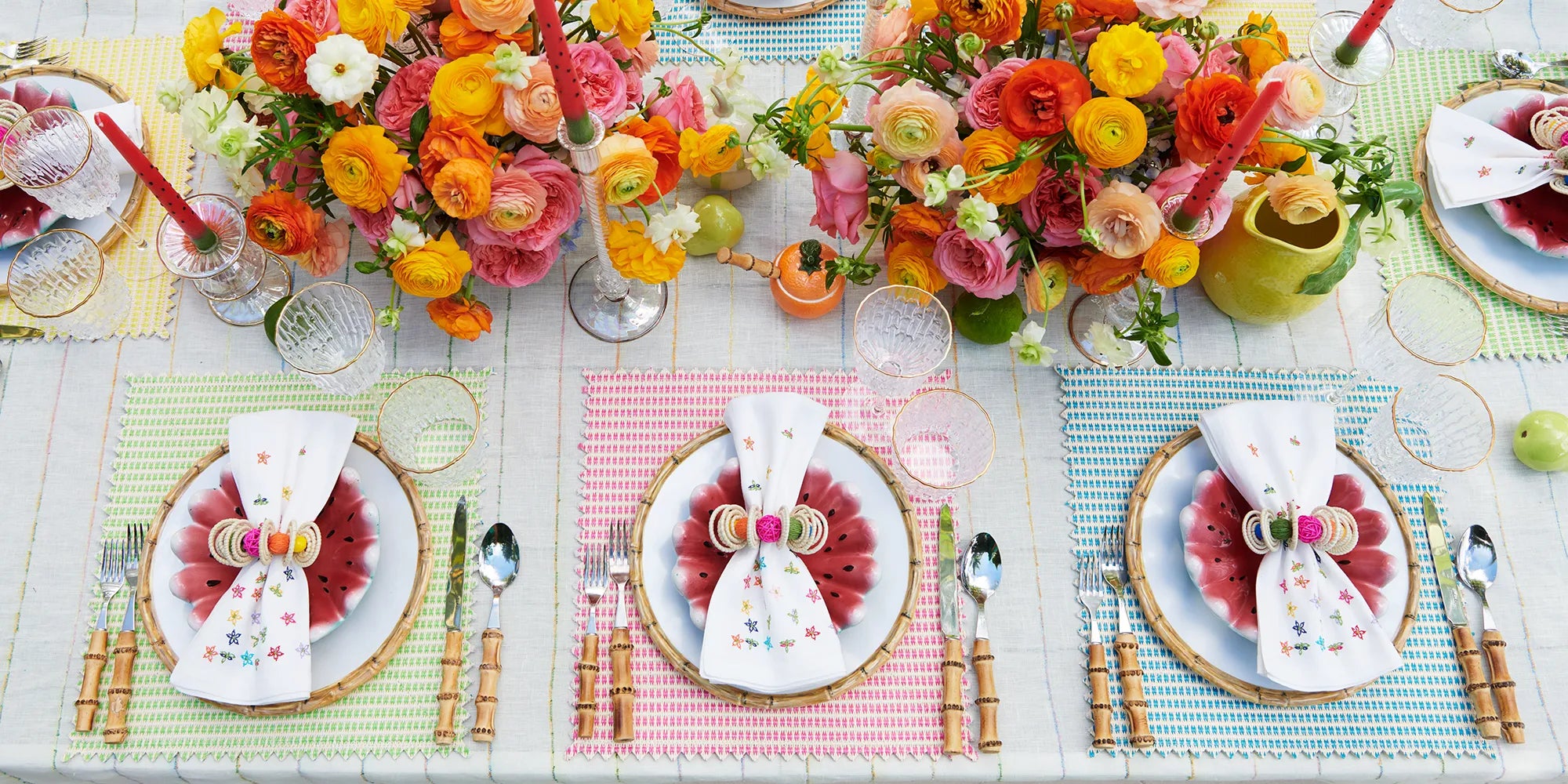 “Kim Seybert’s beautifully elaborate Dahlia Table Runner is the ultimate way to ring in springtime and complete your Easter tablescape.”
